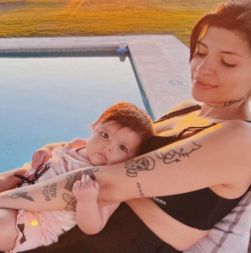 En la primera foto se puede ver perfectamente el rostro de la bebé con una expresión entre enojo y curiosidad mirando fijamente a la cámara mientras su mamá la sostiene luciendo un look bastante natural. Lo llamativo de esta foto es que tiene un gran parecido a Nodal, especialmente en los ojos.