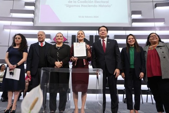 En el marco del Proceso Electoral Federal (PEF) 2023-2024, el Instituto Nacional Electoral (INE) recibió la solicitud de registro como candidata a la Presidencia de la República de la coalición “Sigamos Haciendo Historia”, integrada por Morena, el Partido Verde Ecologista de México (PVEM) y el Partido del Trabajo (PT), de Claudia Sheinbaum Pardo.