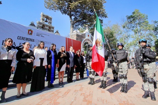 Ante la bandera nacional, Maccise expresó su confianza en construir la grandeza de México desde las calles del municipio y refrendó su compromiso con la niñez.