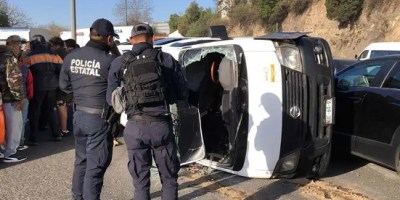 Vuelca camioneta de transporte en Naucalpan, hay varios heridos