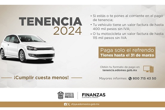 TOLUCA, Estado de México. – La Secretaría de Finanzas del Gobierno del Estado de México, recuerda a los propietarios de vehículos y motocicletas matriculadas en la entidad que el próximo 31 de marzo vence el plazo para pagar el Refrendo, posterior a esta fecha deberán pagar el monto completo de los derechos por Tenencia Vehicular.