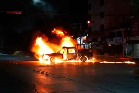Normalistas de Ayotzinapa incendiaron una patrulla pick-up de la Policía Estatal la noche del jueves 7 de marzo en la avenida Guerrero y Constitución al arrojarle bombas molotov, luego de los hechos ocurridos sobre el libramiento de Tixtla en los que murió uno de sus compañeros.