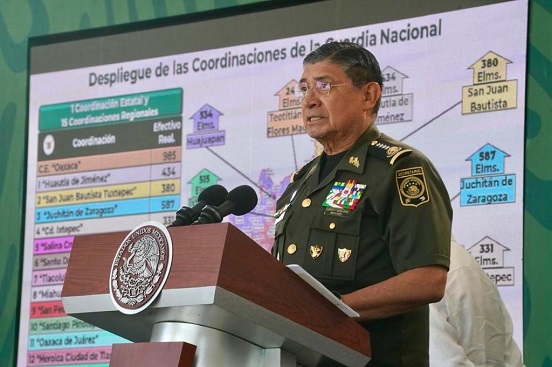 Las y los 6 mil 38 elementos de la Guardia Nacional en la entidad cuentan con una coordinación estatal y 15 regionales; la corporación tiene 14 compañías concluidas que se suman a cinco cedidas por el Ejército Mexicano. En Huatulco se edificará una coordinación de batallón con su unidad habitacional.