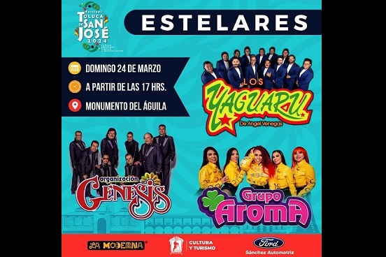 El ritmo y sabor de Los Yaguaru de Angel Venegas, Grupo Aroma y Organización Génesis vestirán de fiesta a la capital mexiquense durante el cierre del Festival Toluca de San José 2024, que se llevará a cabo el domingo 24 de marzo a partir de las 17:00 horas en el Monumento Centenario de la Independencia, conocido también como del Águila.