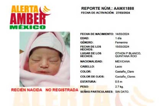 Durante las primeras horas del 27 de marzo, el mecanismo nacional para la búsqueda y localización rápida de niñas, niños y adolescentes desaparecidos, conocido como Alerta Amber, difundió la ficha de búsqueda de una bebé recién nacida que fue robada de los brazos de su madre en Quintana Roo.