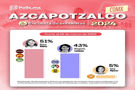 De acuerdo con el portal Polls mx, Nancy Núñez mantiene ventaja en la demarcación por encima de la abanderada del PRI, PAN y PRD, Margarita Saldaña, quien en promedio, se mantiene 8 puntos porcentuales por debajo de la morenista.