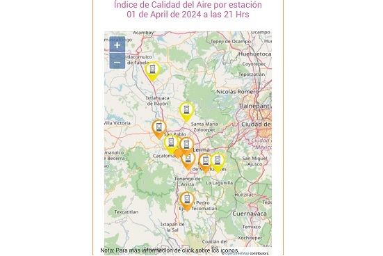 A partir del 1 º de abril, se encuentra disponible la información del Índice de Calidad del Aire y el Índice Aire y Salud, los cuales se actualizan y publican cada hora para conocer el comportamiento de la calidad del aire en la Zona Metropolitana del Valle de Toluca (ZMVT).