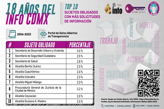 “Este banco es importante porque nos permite responder a preguntas como cuáles son los entes públicos que más solicitudes han recibido en el histórico, siendo los 10 principales: la Secretaría de Desarrollo Urbano y Vivienda, la Secretaría de Seguridad Ciudadana y la Secretaría de Salud, seguidas por las alcaldías Benito Juárez, Cuauhtémoc, Iztacalco, Miguel Hidalgo, la entonces Procuraduría General de Justicia y las alcaldías Coyoacán y Gustavo A. Madero”, precisó.