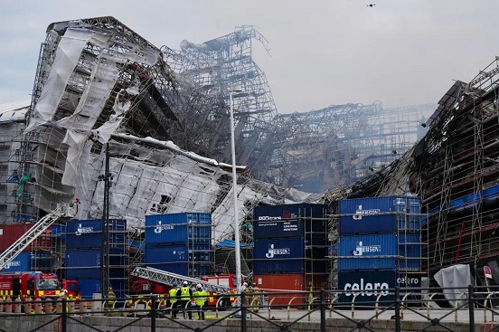 La fachada principal de la antigua Bolsa de Copenhague, devastada por un incendio el martes, se derrumbó el jueves por la tarde, dijeron los servicios de emergencia daneses.