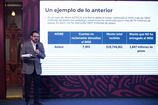 Dijo que, al momento, 347 cuentas que fueron reclamadas han sido devueltas a sus propietarios. Detalló que con la reforma de 2020 y la metodología realizada por la Secretaría de Hacienda en 2021, se estableció un mecanismo por el cual se han devuelto al Seguro Social 259 mil cuentas por un monto de 946 millones de pesos.