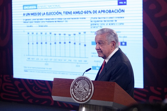 En una, que se levantó vía telefónica, tiene 60 por ciento de aprobación tanto para él como para su gobierno en abril; aquí destacó que en cuatro meses, lo que asegura lleva la campaña en su contra, “subimos seis puntos, en plena guerra sucia”.