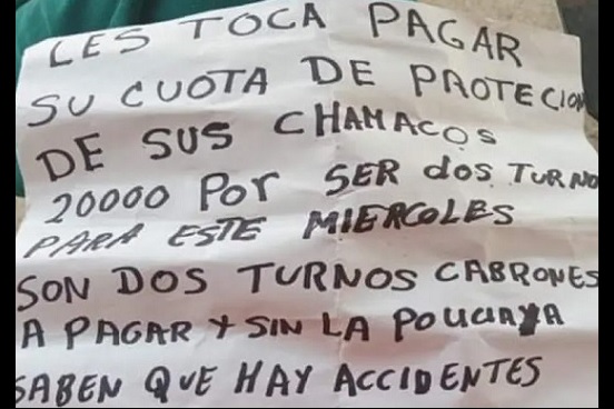 Les toca pagar su cuota de protección a sus chamacos. 20000 por ser dos turnos para este miércoles. Son dos turnos cabrones, a pagar y sin la policía. Saben que hay accidentes», cita en una cartulina.