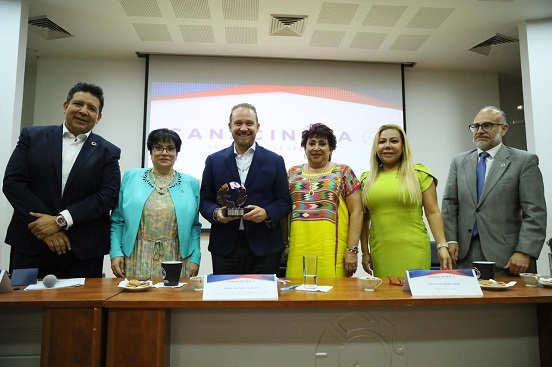 Esperanza Ortega, presidenta nacional de CANACINTRA, organismo que cuenta con 76 delegaciones en el interior de la República, la mayoría de estas en la CDMX, agradeció la presencia de Santiago Taboada y le entregó un reconocimiento a nombre de la Cámara.