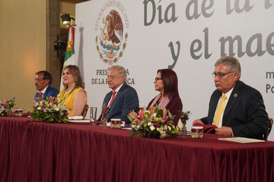 El presidente Andrés Manuel López Obrador conmemoró en Palacio Nacional el Día de la Maestra y el Maestro, a quienes dijo que tendrán garantizado el derecho a la salud y a una pensión digna.