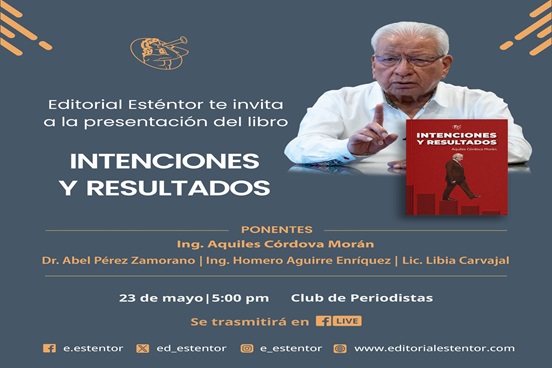 Intenciones y Resultados es el título del nuevo libro de Aquiles Córdova Morán, líder nacional del Movimiento Antorchista, que él mismo presentará, el próximo jueves 23 de mayo, a las 5:00 de la tarde en el “Club de Periodistas de México”, en la Ciudad de México; esta obra, publicada por Editorial Esténtor, se suma al extenso catálogo de al menos 30 libros que ha escrito y que están orientados a politizar, concientizar y organizar a los mexicanos.