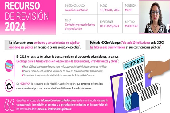 Al posicionar el recurso de revisión interpuesto en contra de la alcaldía Cuauhtémoc, identificado con el número de expediente INFOCDMX.RR.IP.1553/2024, María del Carmen Nava Polina, Comisionada Ciudadana del INFOCM, puntualizó que garantizar el acceso a la información relacionado con contrataciones es de suma importancia para la transparencia y la rendición de cuentas, así como para la participación social en la supervisión de las actividades de las instituciones públicas.