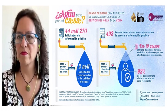 + En el actual contexto, es sabido que hay un interés especial sobre el tema del agua y su calidad en la Ciudad de México, así como su disponibilidad, su distribución y la calidad de esta. En atención a esta preocupación, de manera proactiva, ponemos a disposición la base de datos en donde encontramos 44 mil 270 solicitudes de información relacionadas con el tema del agua: María del Carmen Nava Polina.