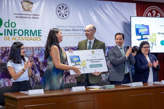 Antes de proceder a la lectura del informe de resultados, Barrera Díaz mostró su compromiso con la mejora continua de la Facultad de Lenguas entregando 20 equipos de cómputo para fortalecer el Laboratorio Digital de Idiomas y 100 pupitres, beneficiando así a la comunidad estudiantil. Estos esfuerzos se suman a los trabajos de ampliación y equipamiento del tercer nivel del Edificio “C”, que ya se encuentran concluidos, demostrando un avance significativo en las instalaciones de la facultad.