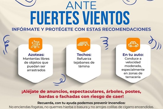 De igual forma, se pide mantenerse alejados de anuncios y espectaculares, árboles, postes, bardas o fachadas con riesgo de caer. A fin de prevenir incendios, evitar encender fogatas, quemar hierba o basura y arrojar colillas de cigarro encendidas, ya que con los fuertes vientos el fuego se propaga de manera rápida.