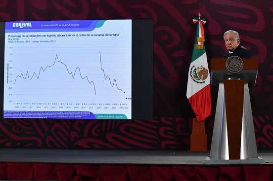“Vamos bien”, aseguró el mandatario al mostrar en su conferencia de prensa diaria en Palacio Nacional cifras dadas a conocer la víspera por el Consejo Nacional de Evaluación de la Política de Desarrollo Social (Coneval) que indican que en el primer trimestre de 2024 la pobreza laboral se ubicó en 35.8 por ciento, 1.9 por ciento menos que el año pasado, lo que quiere decir que se redujo la población general cuyos ingresos provenientes del trabajo no alcanzan para costear sus necesidades mínimas.