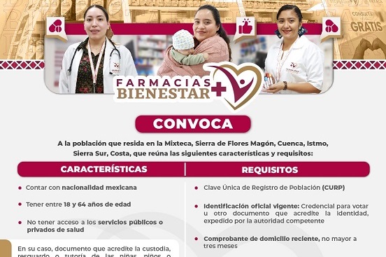 Oaxaca de Juárez, Oax.- El Gobierno del Estado a través de la Secretaría de Bienestar, Tequio e Inclusión (Sebienti) convoca a la población que reside en las regiones Mixteca, Sierra de Flores Magón, Cuenca del Papaloapan, Istmo, Sierra Sur y Costa, a inscribirse en el programa de Atención a la Población con Carencia por Acceso a los Servicios de Salud, Farmacias Bienestar.