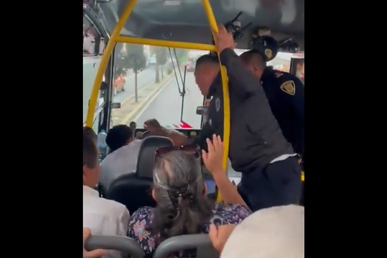 Los vamos a grabar, los estamos grabando”, se escucha decir a las personas que van como pasajeros en el camión, quienes exigen a los policías que se bajen.