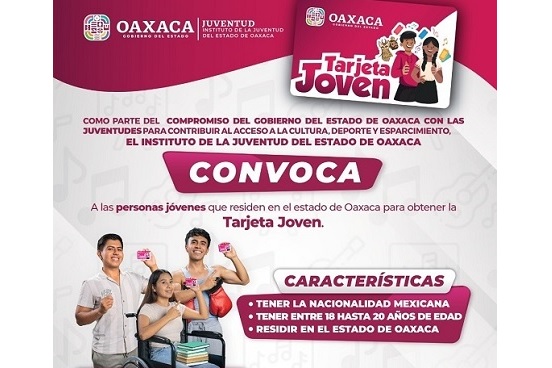 Oaxaca de Juárez, Oax.- El Gobierno del Estado de Oaxaca a través del Instituto de la Juventud del Estado de Oaxaca (Injeo) convoca a las personas de 18 a 20 años que residan en la entidad a solicitar la Tarjeta Joven, un programa social que permite el acceso a prácticas culturales, artísticas y deportivas sin costo o con descuentos.