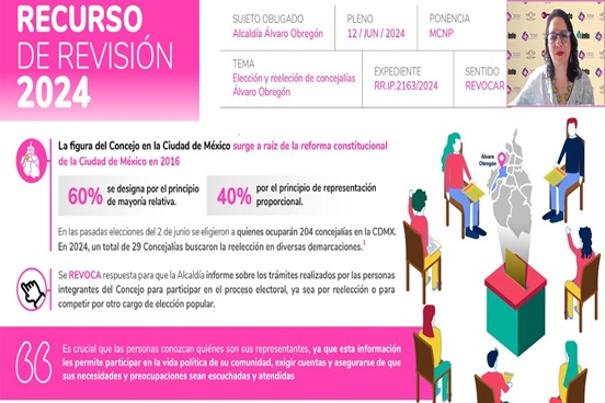 Al posicionar el recurso INFOCDMX.RR.IP.1553/2024, en contra de la alcaldía Álvaro Obregón, María del Carmen Nava Polina, Comisionada Ciudadana del INFOCM, precisó que la información solicitada es crucial para que la sociedad pueda conocer y evaluar las acciones y justificaciones de las personas integrantes del Concejo de la demarcación que participaron en actividades de campaña, para asegurar así que cumplan con las normativas y procesos establecidos.