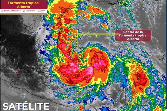 De acuerdo con el pronóstico del Servicio Meteorológico Nacional (SMN), en las próximas horas, la tormenta tropical Alberto se aproximará a las costas de Tamaulipas y Veracruz, su amplia circulación ocasionará lluvias puntuales torrenciales en Coahuila, Hidalgo, Nuevo León, Puebla, Querétaro, San Luis Potosí, Tamaulipas y Veracruz; puntuales intensas en Tabasco y Zacatecas; puntuales muy fuertes en Guanajuato y Tlaxcala; fuertes en el Estado de México, e intervalos de chubascos en la Ciudad de México y Morelos.