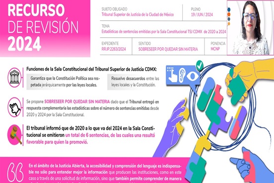 Lo anterior luego de que la Comisionada posicionara el recurso de revisión INFOCDMX/RR.IP.2263/2024 de acceso a la información pública presentado en contra de Tribunal Superior de Justicia de la Ciudad de México (TJACM), durante la Vigésima Segunda Sesión Ordinaria del Pleno del Instituto de Transparencia, Acceso a la Información Pública, Protección de Datos Personales y Rendición de Cuentas de la Ciudad de México (INFOCM).