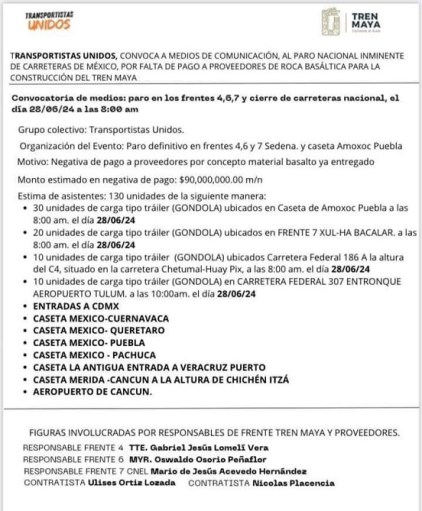 Transportistas Unidos anunciaron un paro nacional para este viernes 28 de junio que afectará las carreteras en México, entre ellas, entradas a la Ciudad de México (CDMX), lo cual afectaría a miles que transitan por los puntos en donde estará el bloqueo.