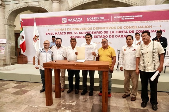 Oaxaca de Juárez, Oax.- En el marco del 33 aniversario de la Junta de Conciliación Agraria del Estado de Oaxaca (JCA), el Gobernador Salomón Jara Cruz encabezó la firma de cuatro convenios de paz en materia agraria que abonan a la gobernabilidad de la entidad.