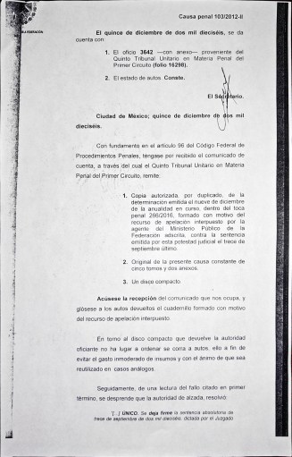 Con fecha del 15 de diciembre de 2016 el Juzgado Primero de Distrito de Procesos Penales Federales en la Ciudad de México, emitió un acuerdo que en su párrafo esencial y concluyente sobre la causa penal 103/2012-II dice: