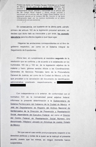 ÚNICO. Se deja firme la sentencia absolutoria de 13 de septiembre de 2016 dictada por el Juzgado Primero de Distrito de Procesos Penales Federales en la Ciudad de México en los autos de la causa penal 103/2012 que absolvió a…..(no citamos el nombre en acatamiento a la ley de protección de datos personales), del delito de hostigamiento sexual , previsto y sancionado en el artículo 259 Bis del Código Penal Federal y abuso sexual, previsto y sancionado en el artículo 260 del Código Penal Federal, con la agravante prevista en el numeral 266 Bi, fracción III de dicho ordenamiento legal, por lo motivos expresados en el último considerando de esta sentencia”.