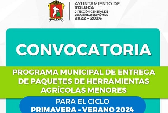 Con el fin de impulsar y apoyar la actividad rural, el Ayuntamiento de Toluca invita a los productores a participar en el programa municipal de entrega de paquetes de herramientas agrícolas menores.