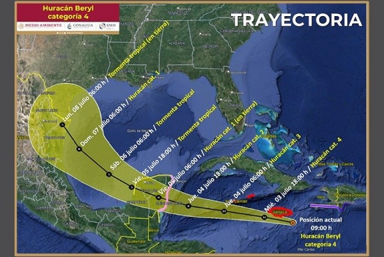 La coordinadora de Protección Civil expuso al presidente Andrés Manuel López Obrador y representantes de los medios de comunicación que Beryl se encuentra en la región central del mar Caribe. Se prevé que impacte la noche del jueves 4 de julio o la madrugada del viernes 5 de julio entre los municipios de Tulum y Felipe Carrillo Puerto.