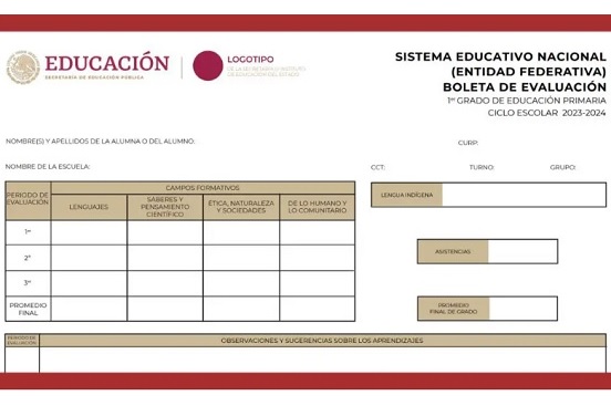 En las fases 3, 4 y 5, que abarcan la primaria, las boletas también muestran los campos formativos, divididos en tres evaluaciones parciales, y cuentan con un apartado para observaciones.