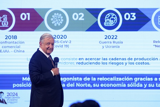 El 52 por ciento de la IED, dijo, proviene de Estados Unidos y Canadá debido al Tratado de Libre Comercio (T-MEC) en América del Norte. Este acuerdo permite la relocalización de empresas en México o ‘nearshoring’, mecanismo que consiste en acercar a las y los consumidores las cadenas de producción reduciendo riesgos y costos.