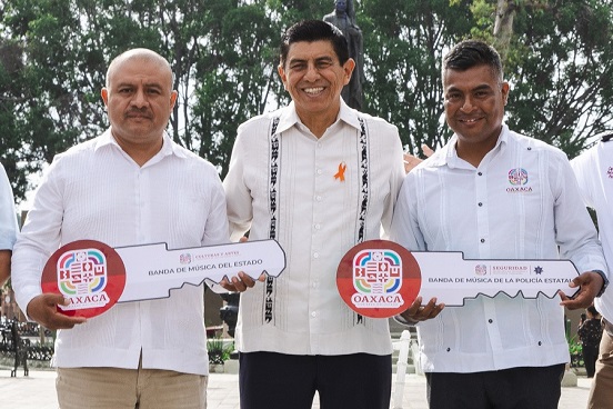 Así, frente a la estatua del ilustre oaxaqueño Benito Juárez García, el titular del Poder Ejecutivo otorgó de forma simbólica las llaves de estos transportes al director de la Banda de Música del Estado, Alejandro Guantes Teodosio y al director de la Banda de Música de la Policía Estatal, Adolfo León Aquino.