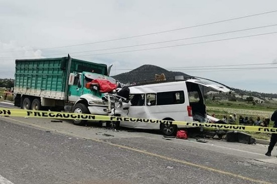 Una camioneta tipo urvan y un camión de carga colisionaron de frente en la carretera San Luis Atexcac-Guadalupe Victoria; reporte preliminar indica que hay 9 muertos y 12 heridos.