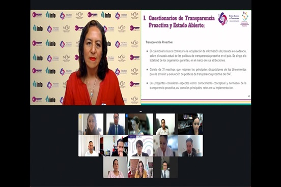 Durante la sesión de trabajo, que se realizó de manera virtual, la Comisionada Ciudadana de este órgano garante, María del Carmen Nava Polina compartió los avances y acciones llevadas a cabo desde el equipo de Estado Abierto con respecto a datos abiertos y Apertura Institucional.