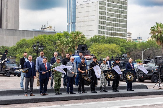 En la Explanada de los Héroes y ante funcionarios estatales y federales, y policías de Fuerza Civil, el Mandatario neolonés dio el banderazo de salida a las unidades acompañado de Gerardo Escamilla Vargas, Secretario de Seguridad.