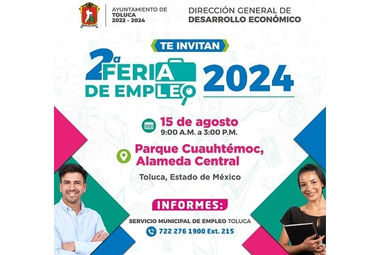 La feria se llevará a cabo el 15 de agosto en la Alameda Central, de 9:00 a 15:00 horas, y contará con la participación de más de 110 empresas del Valle de Toluca, que ofertarán más de mil 500 vacantes.