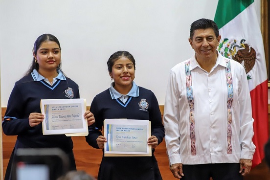 Oaxaca de Juárez, Oax.- A nombre del pueblo de Oaxaca, el Gobernador Salomón Jara Cruz reconoció a las estudiantes del Bachillerato Integral Comunitario de Teotitlán del Valle (BIC 29), Shanni Valeria Mora Fajardo y Rosa Mendoza Sosa, por obtener el Diploma de Excelencia en el certamen internacional en el Premio Juvenil del Agua Estocolmo 2024 (Stockholm Junior Water Prize).