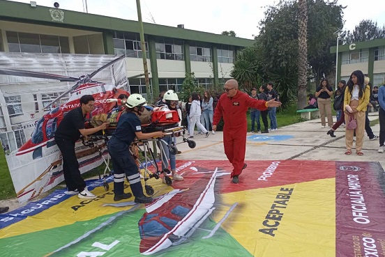 TEXCOCO, Estado de México.- En el marco de la conmemoración de los sismos de 1985 y 2017, y para concientizar a la comunidad estudiantil de la Universidad Autónoma del Estado de México (UAEMéx) sobre la necesidad de involucrarse en los programas de Protección Civil, la Unidad de Rescate Aéreo “Relámpagos” participó en la Semana Municipal de Protección Civil de Texcoco.