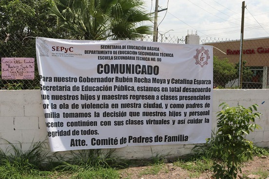 “Estamos en total desacuerdo que nuestros hijos y maestros regresen a clases presenciales por la ola de violencia en nuestra ciudad, y como padres de familia tomamos la decisión que nuestros hijos y personal docente continúen con sus clases virtuales y así cuidar la seguridad de todos”, dice el texto colocado.