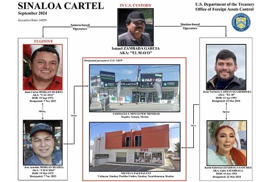 De manera similar, Farmacia y Mini Super Trinidad es propiedad del narcotraficante con sede en Nogales, José Arnoldo Morgan Huerta («Chachio»), hermano de Juan Carlos Morgan Huerta («Cacayo»), jefe de plaza del Cártel de Sinaloa en Nogales, Sonora desde donde administra y supervisa el tráfico de toneladas de drogas, que incluyen cocaína, heroína, metanfetamina y fentanilo ilícito, desde México a los Estados Unidos.
