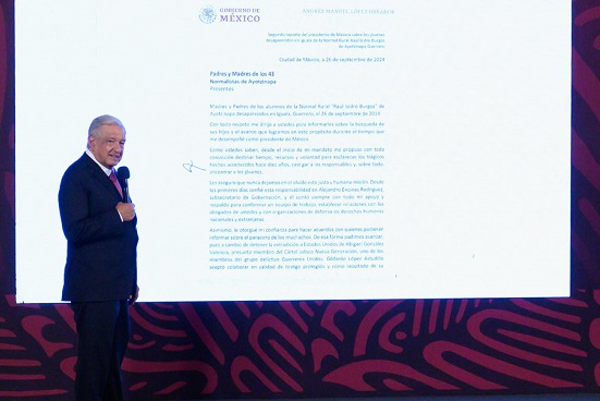 En la misiva a familiares de padres y madres de familia con motivo de los diez años del caso Ayotzinapa, el titular del Ejecutivo federal expresó que «hasta el último momento de mi gobierno continuaremos buscando a los jóvenes. Y considero que este vergonzoso y lamentable asunto no debe cerrarse nunca; es un expediente abierto».