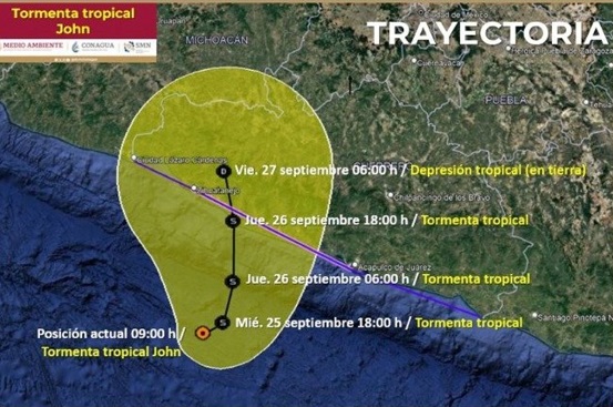 La tormenta John tocará tierra de nuevo en Guerrero, de acuerdo con los pronósticos del Servicio Meteorológico Nacional (SMN). Según la trayectoria pronosticada, el ciclón ingresará a tierra la tarde del jueves 26 de septiembre cerca de Zihuatanejo.