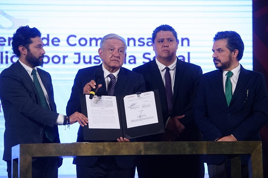 El presidente Andrés Manuel López Obrador atestiguó la firma del convenio que suma mil 350 extrabajadores de Luz y Fuerza del Centro (LyFC) al Sistema de Compensación Vitalicia por Justicia Social, mecanismo que repara daños a los afectados por la extinción de la compañía en 2009 durante el sexenio de Felipe Calderón.